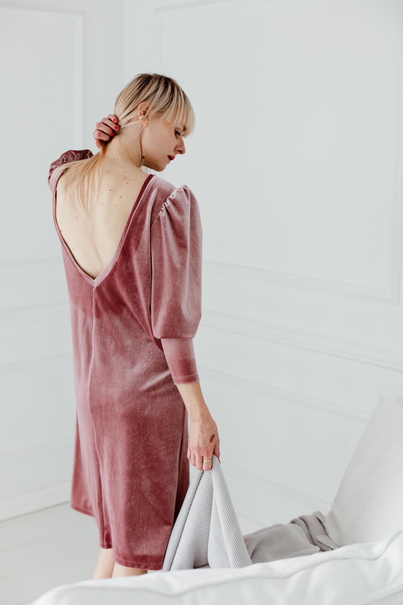 Sukienka w przepięknym intensywnym kolorze różu. Uszyta z delikatnej tkaniny velvet. Z tyłu rozcięcie w kształcie litery V.